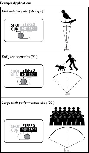 - Shotgun and Stereo (90 Degree/120 Degree) directional controls can be easily adjusted using the directivity switch for use in a variety of shooting situations.